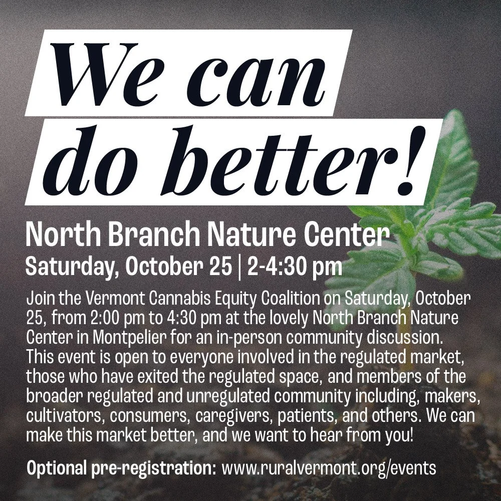 Join the Vermont Cannabis Equity Coalition on Saturday, October 25, from 2:00 pm to 4:30 pm at the lovely North Branch Nature Center in Montpelier for an in-person community discussion. This event is open to everyone involved in the regulated market, those who have exited the regulated space, and members of the broader regulated and unregulated community, including makers, cultivators, consumers, caregivers, patients, organizers, and others. We can make this market better, and we want to hear from you!