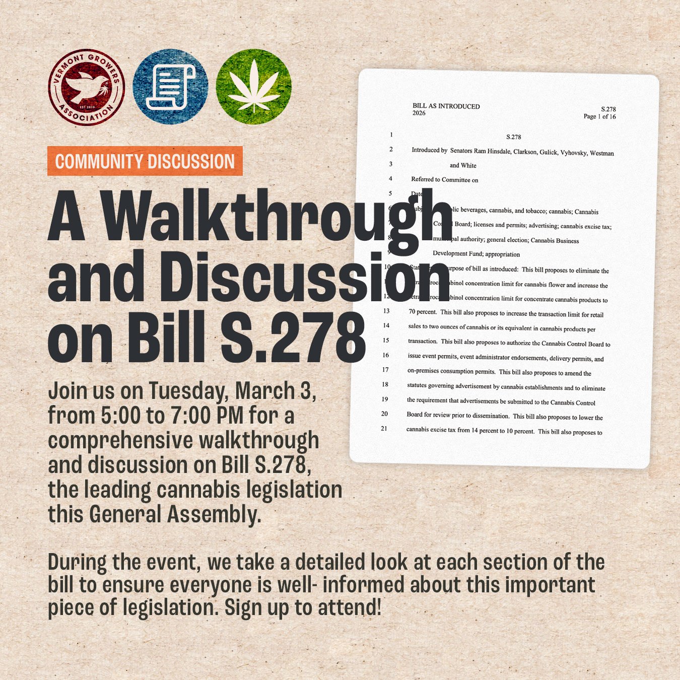 Join us on Tuesday, March 3, from 5:00 to 7:00 PM for a comprehensive walkthrough and discussion on Bill S.278, the leading cannabis legislation this General Assembly.