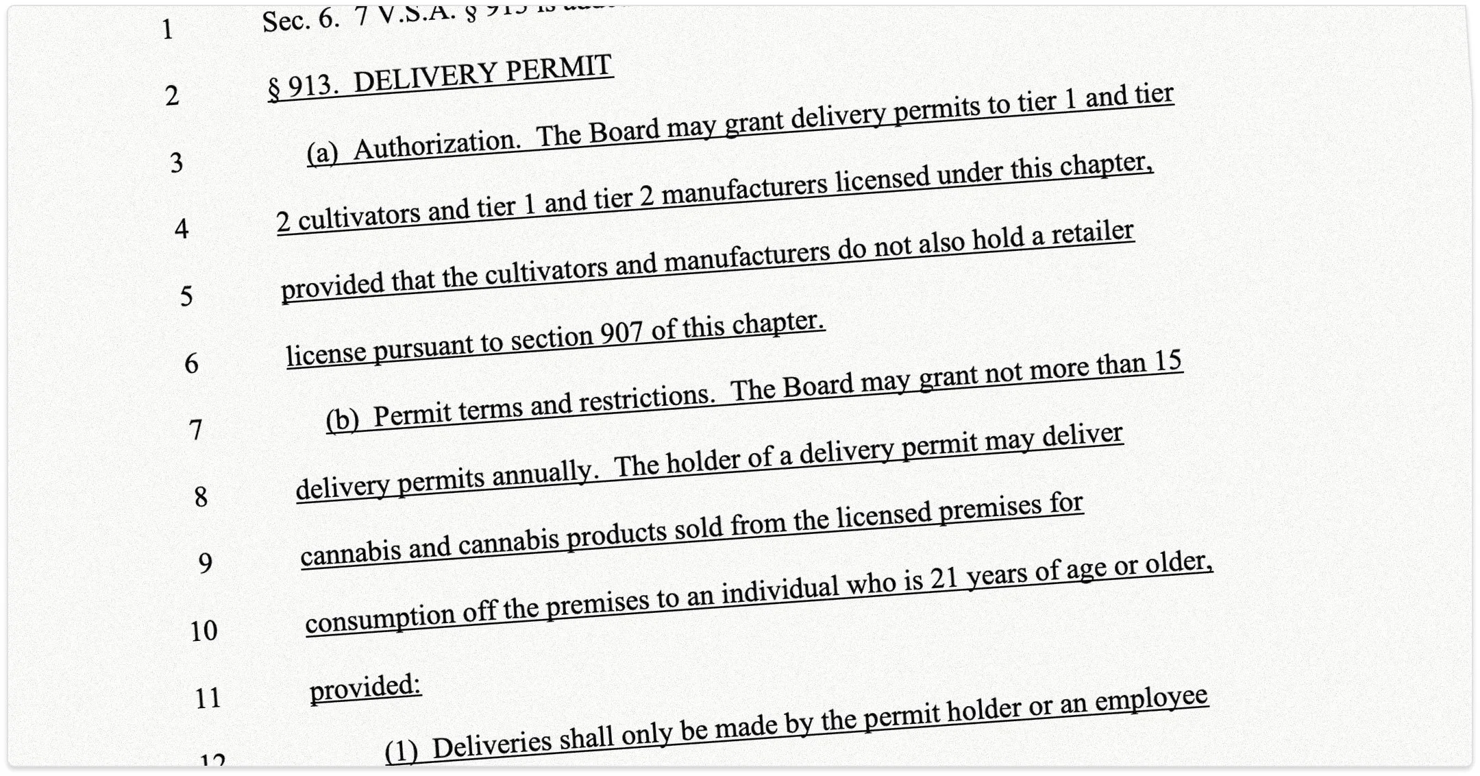 This section proposes a new Delivery Permit pilot program, available to Tier 1 and 2 Cultivators and Manufacturers who do not also hold a retail license. The permit allows sales via delivery to addresses in Vermont between 9 am and 5 pm, and the licensee or an employee must make all deliveries. It tasks the CCB with developing rules for the new permit, including permit restrictions, storage and security requirements, and additional rules determined by the agency. The permit costs $100. No more than 15 permits may be issued each year over the course of two years when the pilot ends, and lawmakers are to consider changes and codify the policy into law.